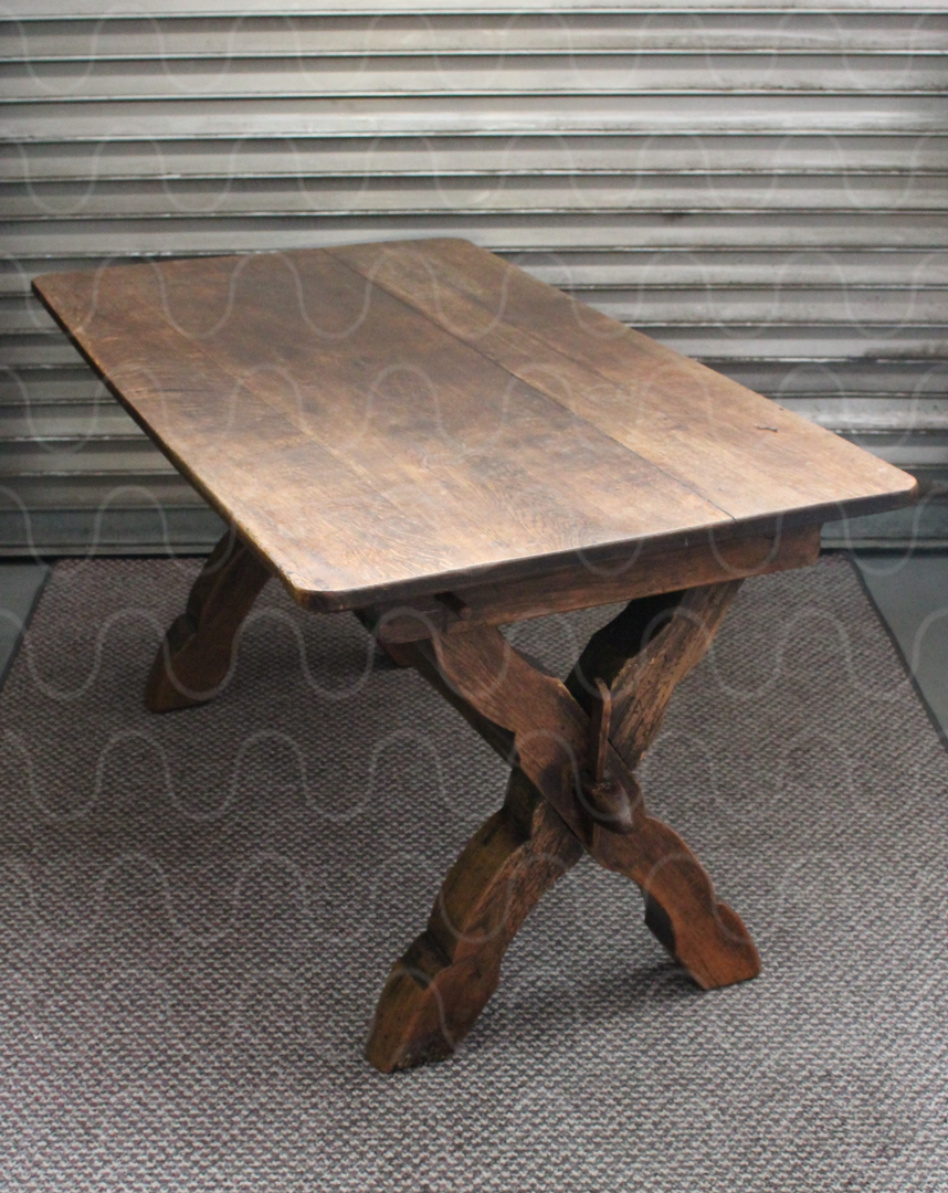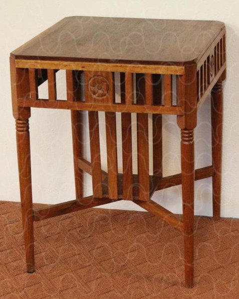 Tisch, dunkles Holz, gedrechselte Beine, kreuzförmig miteinander verbunden