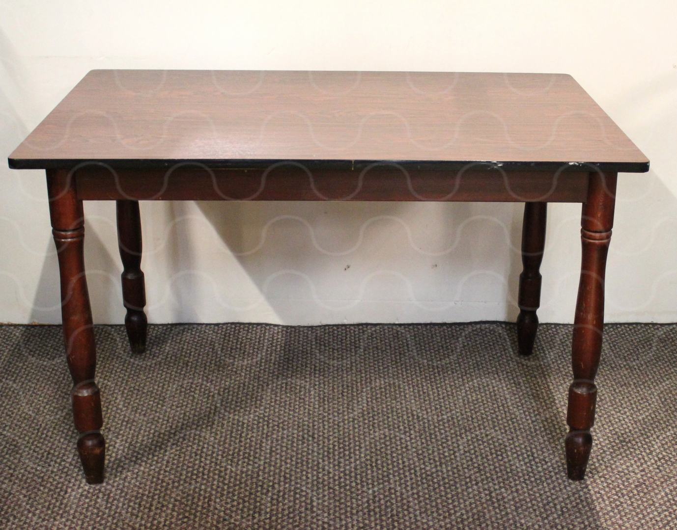 Tisch, helles Holzgestell, Resopalplatte und -rand
