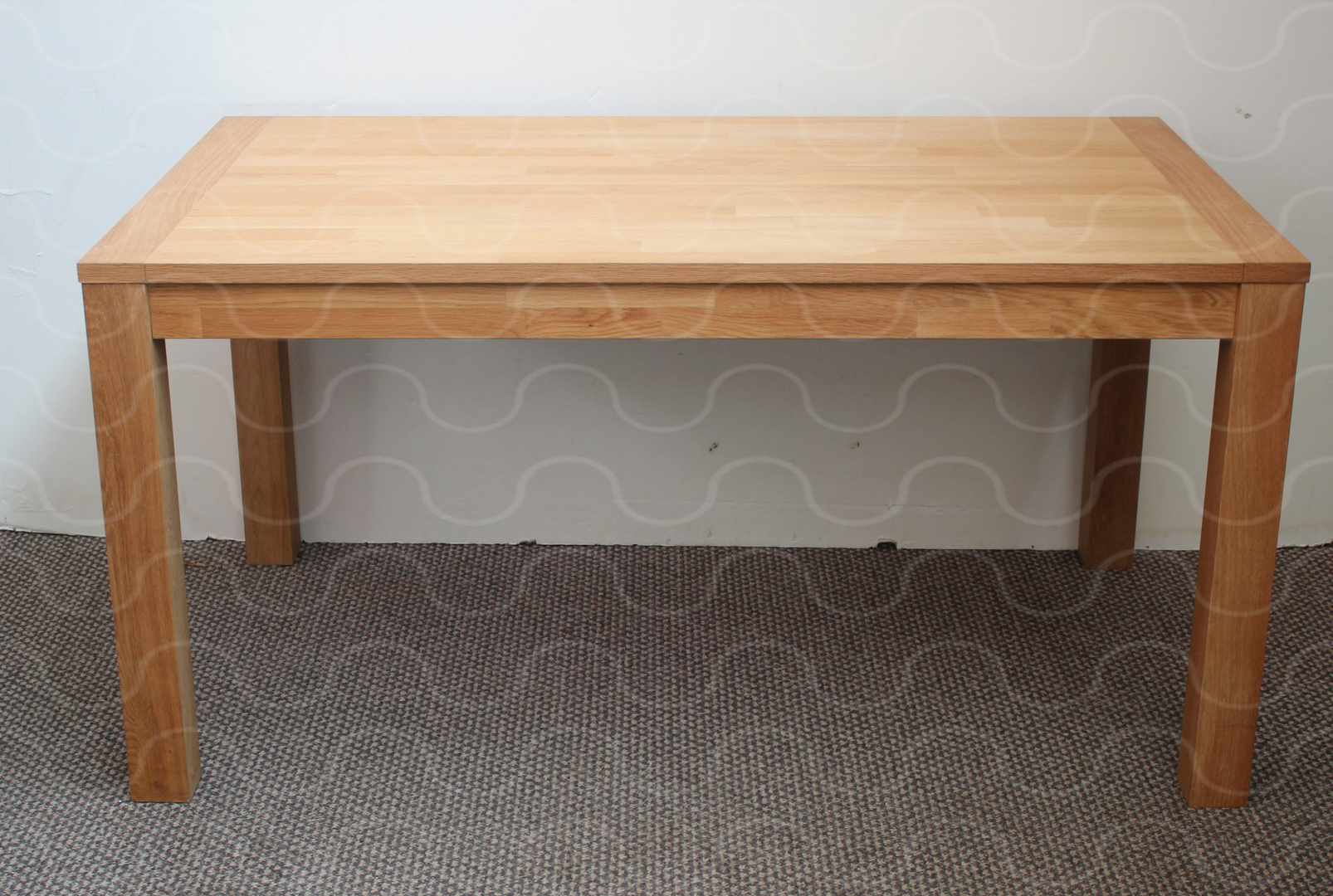 Esstisch, Peter, mittelbraunes Eichenholz, Beine am Außenrand, abgerundete Ecken, ausziehbar