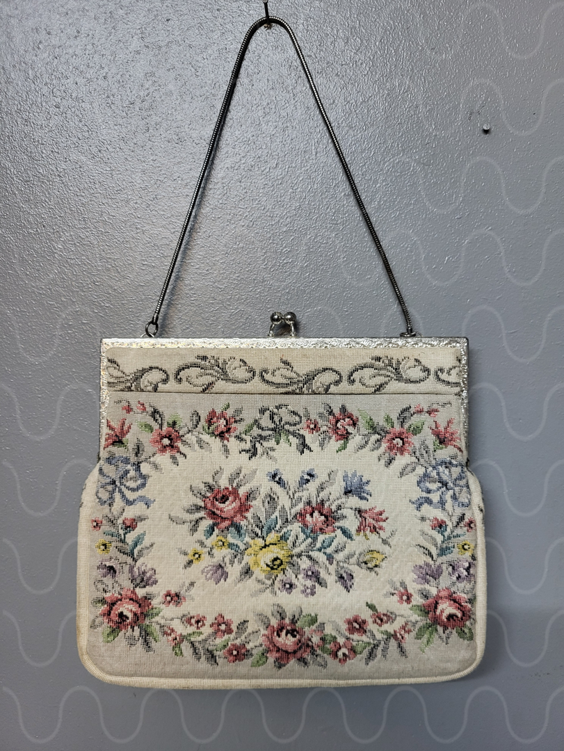 Damenhandtasche, Tapisserie beige, Blumenstrauß,