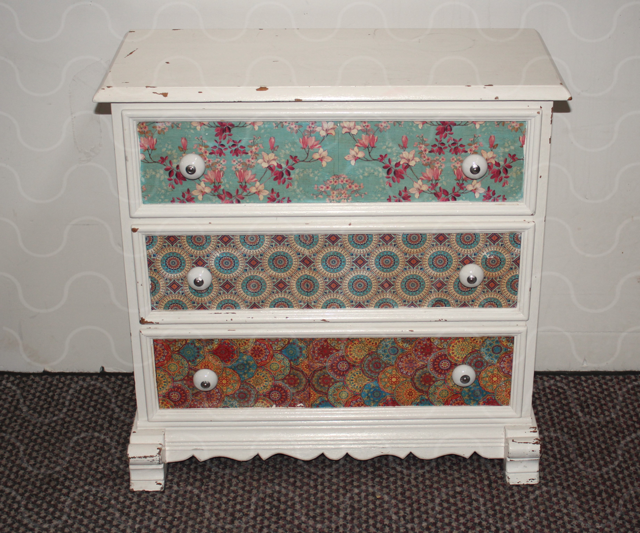 Flurkommode, weißes Holz, Vintage, 3 Tapetenschubfächer,