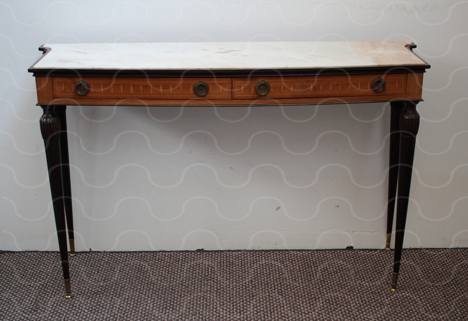 Konsole, weiße Marmorplatte, schwarzes Eisengestell, Beine hinten gerade, Beine vorn nach außen geschwungen, Füße vorn gerollt