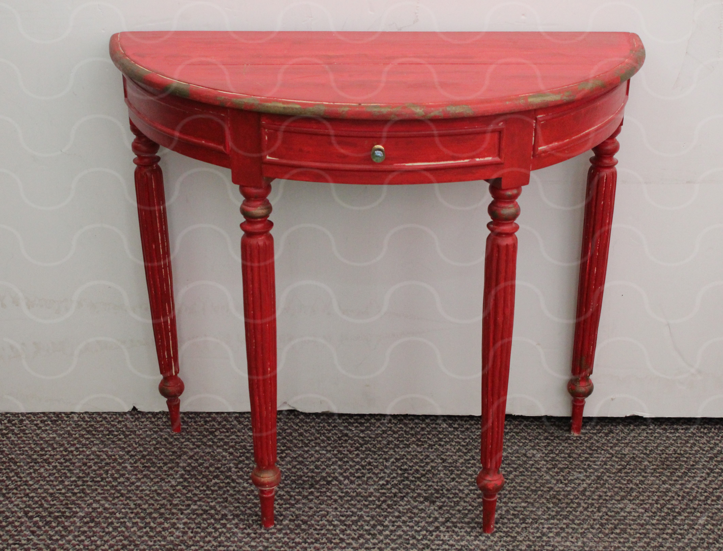 Konsolentisch, altweißes Holz, 2 Schubfächer, 1 Ablageplatte, abgerundete Ecken, leicht gedrechselte Beine, shabby Look
