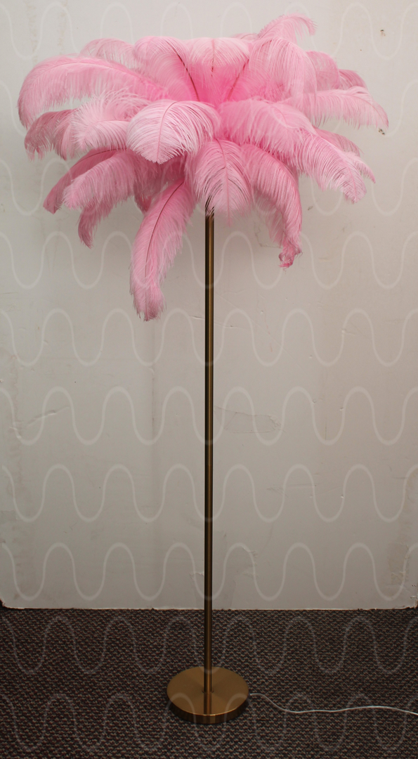 Stehlampe, Messingständer mit 3 Füßen, altrosafarbener gewölbter Schirm, oben geschlossen, mit Fransen