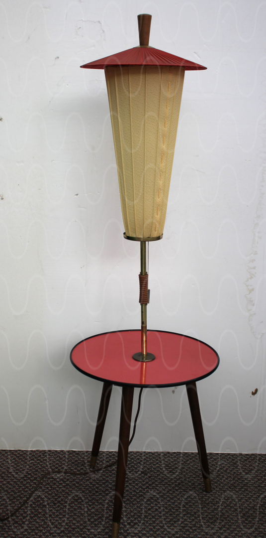 Stehlampe, Holzfuß, grün-rot-gelb-schwarz gemusterter Schirm
