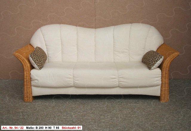 Sofa, Rattangestell, weißer Stoffbezug, 3-Sitzer
