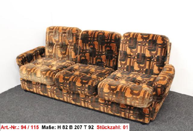 Sofa, braun-schwarz-orangefarbener Veloursbezug mit geometrischen Mustern