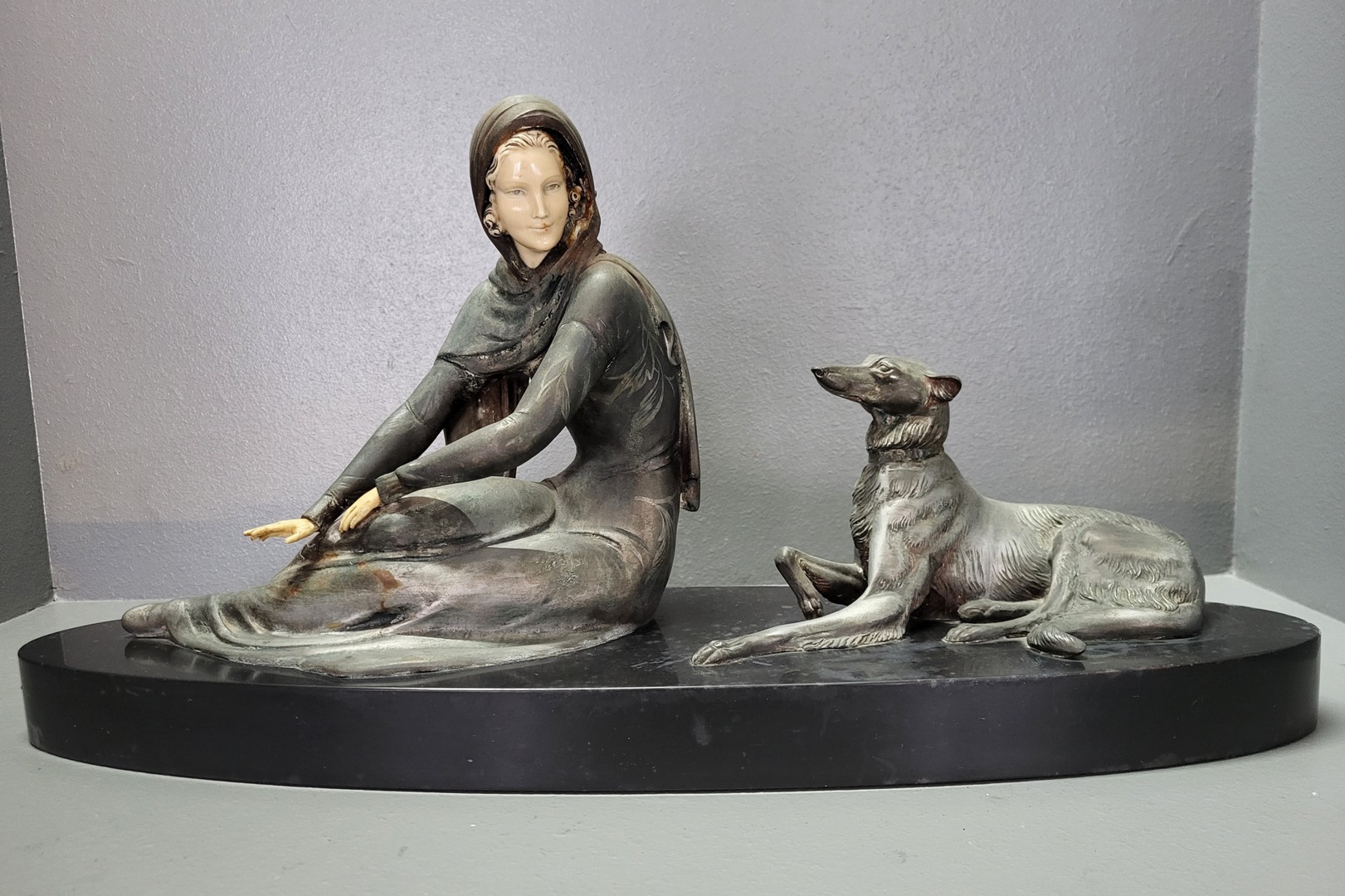 Göttinnenfigur, indisch, grauer Marmor, z.T. Malereispuren, antik, Göttinnengestalt mit Sari in Rahmen, 1 Hand abgebrochen