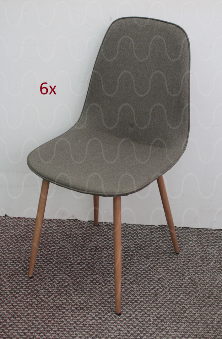 Stuhl, dunkelbraunes Holzgestell, grauer Stoffsitz und Rückenlehne