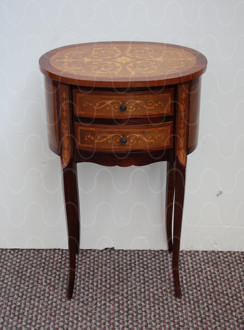 Nachttisch, Holzfurnier, oval, Rokoko, Intarsien,