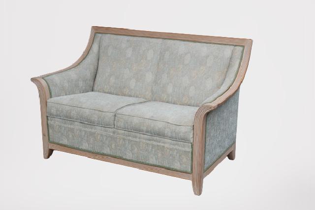 Sofa,2-Sitzer,Holzgestell,beige-w.,Rillen,leicht geschwungene Form,blaßgrün-beige,Tulpenmuster,Borten,grün,B138,T76,H89